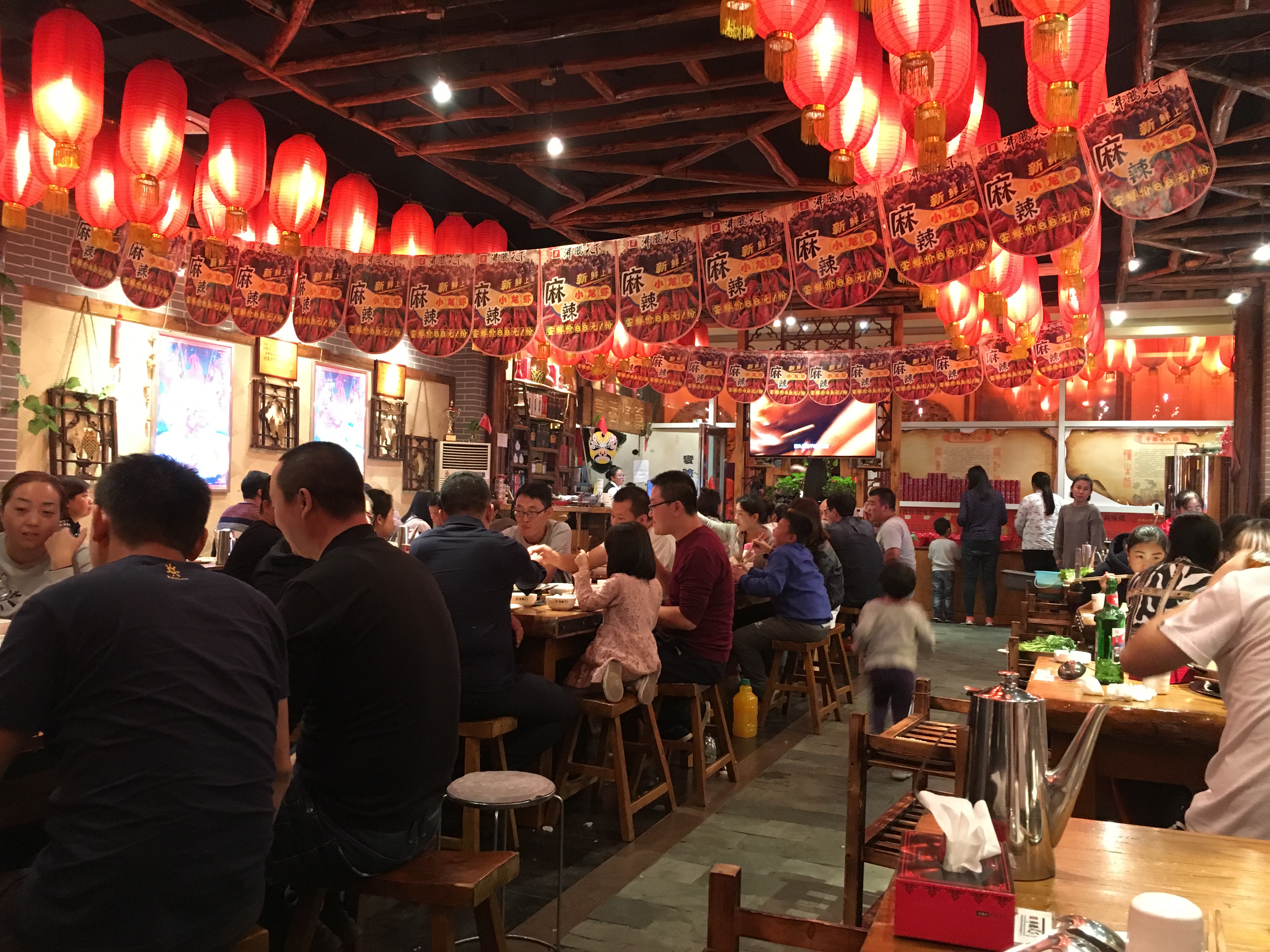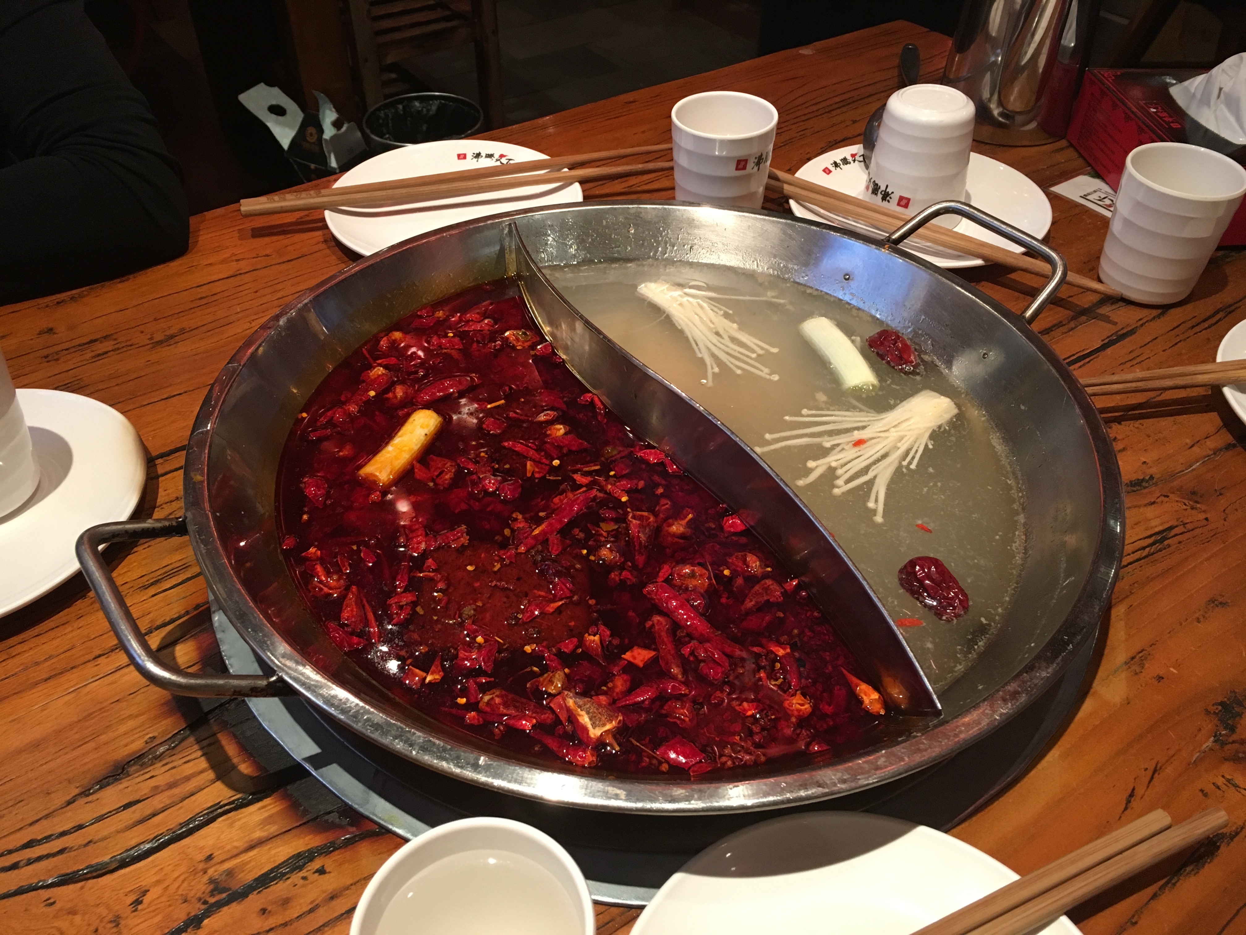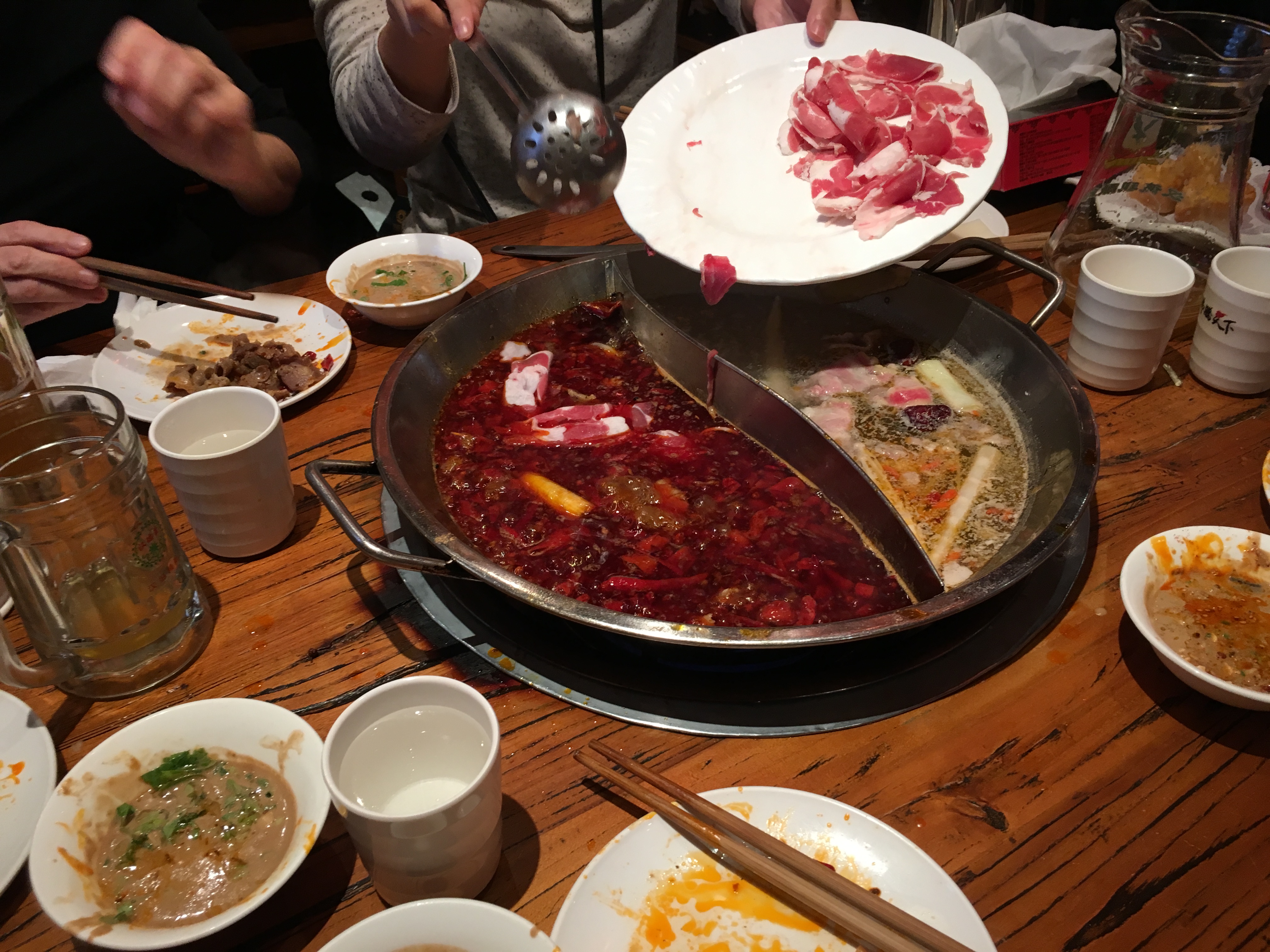 Ce soir nous avons fait l’expérience des HotPot ou fondue chinoise. Un côté piquant et un côté doux. Petite sauce aux arachides et un mélange de viande, légumes, racine de lotus et tofu à faire cuire. Ce que nous ne voyons pas c’est qu’il y a un bruleur au gaz dans la table, sous le bol. Bien évidemment la bière et l’alcool chinois étaient de mise. Une superbe expérience culinaire et culturelle.