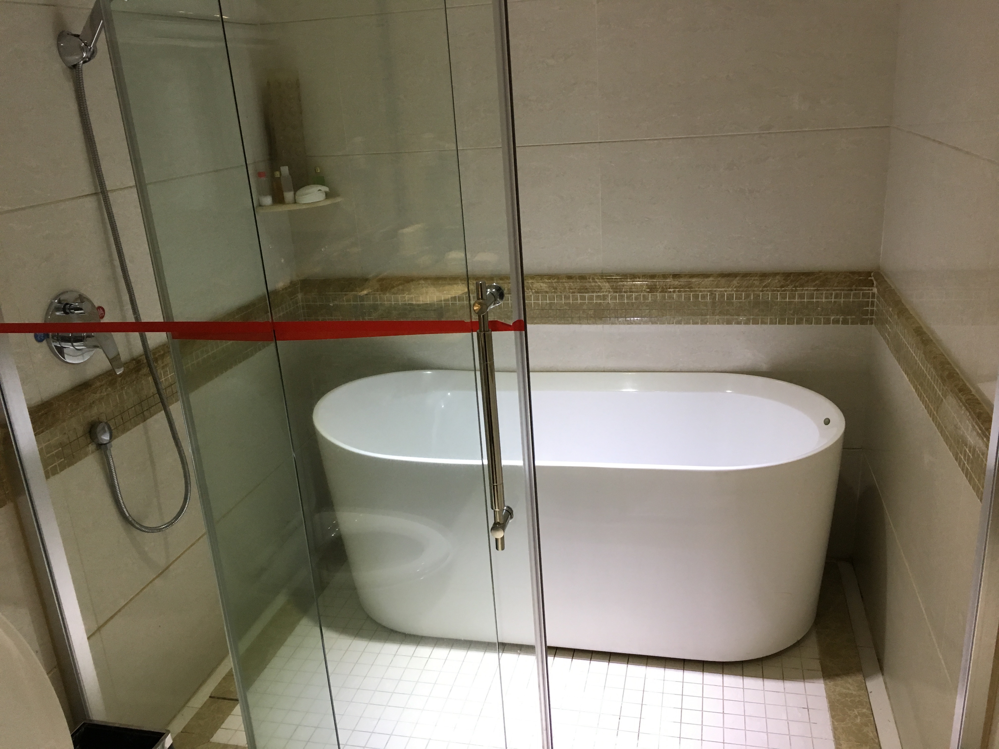 Petite particularité de la chambre d’hôtel ici. Il y a un bain dans la douche, est-ce que ça veut dire qu’on appelle ça une douchoire? Aussi, il y a un petit coin salon avec du thé et tout le nécessaire. Par contre, pas de vue sur la salle de bain.